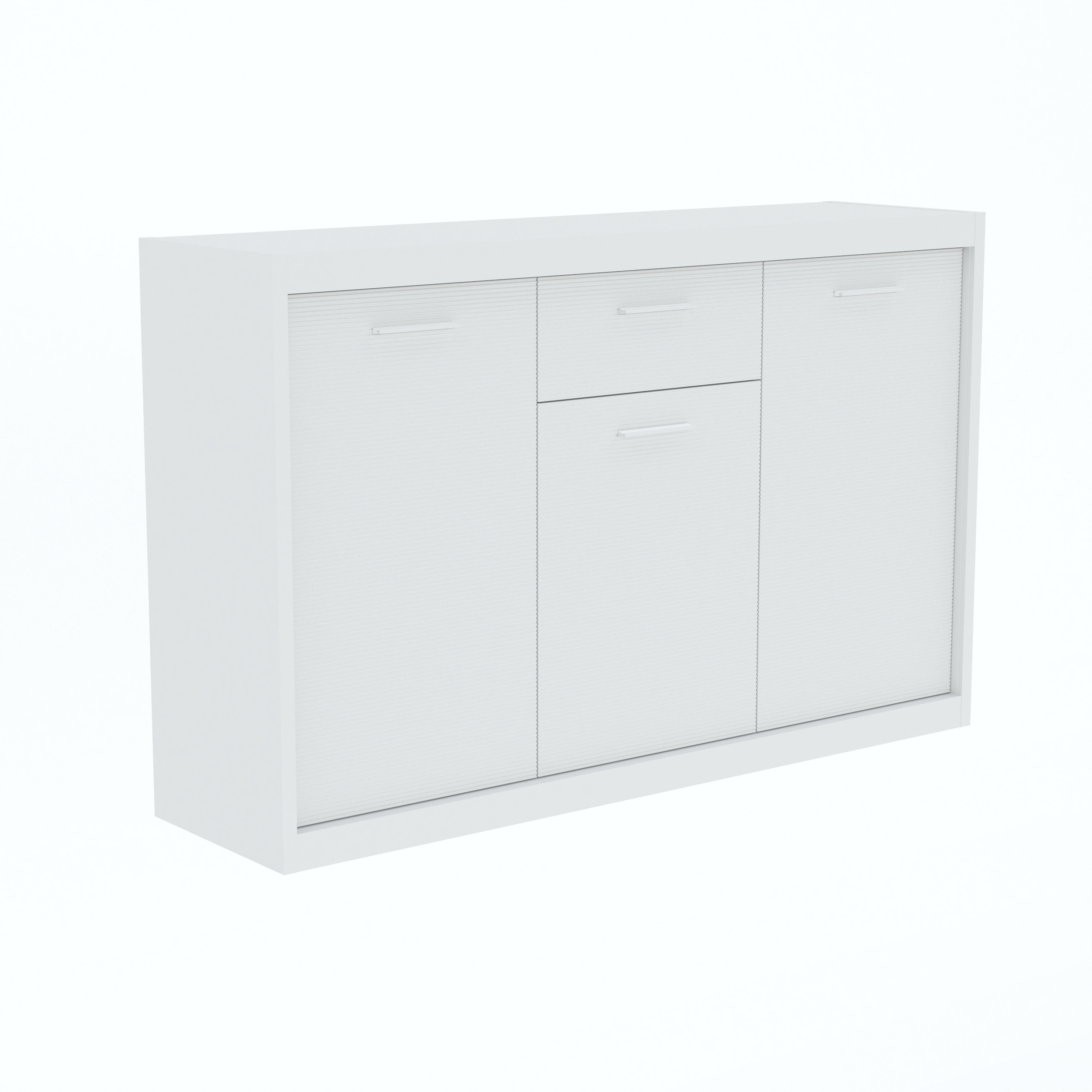 Aparador de 3 puertas y 1 cajón fabricado en color blanco. Diseño del frente de las puertas en color blanco brillo con relieve. Tiradores en color gris.