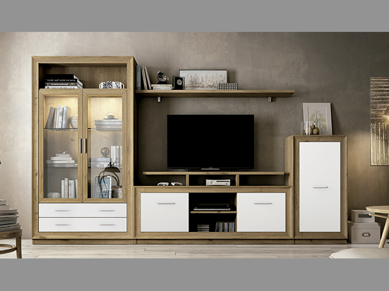Composición de mueble de salón de 3 metros. Fabricado en color salermo con los frentes de las puertas en color blanco.