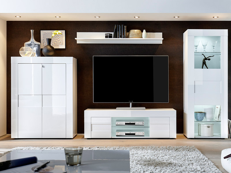 Apilable de diseño acabado en blanco brillo formado por:Mueble TV 138x33x42 cmMueble 2 Puertas 92x115x42 cmVitrina 1 Puerta 61x167x42 cmEstante 138x18x20