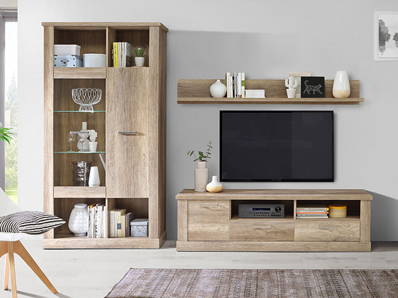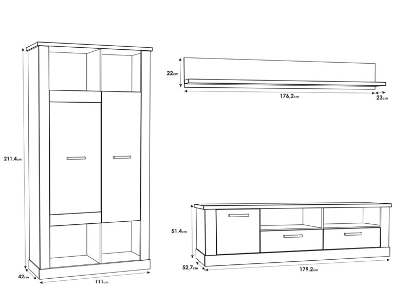 Apilable de 3 modulos en color roble antiguo.- Mesa TV 1 puerta + 2 cajones: 179,2cm ancho x 51,4 cm alto x 52,7cm fondo.- Estante de pared 179,2cm ancho x 23cm alto x 22cm fondo.- Vitrina alta 1 puerta 1 cajón con luz led: 211,4cm alto x 111cm ancho x 42cm fondo.