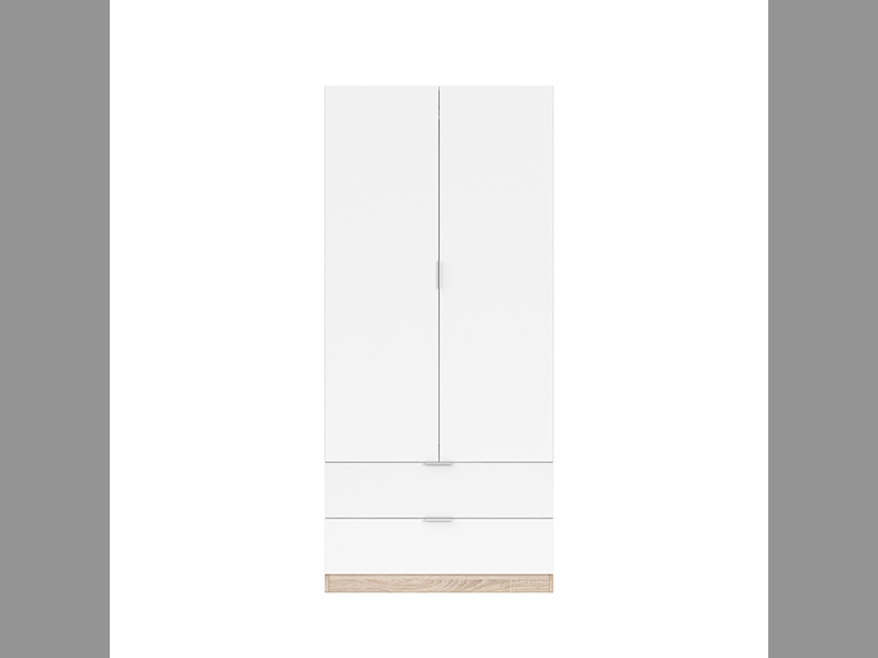 Armario de 2 puertas y 2 cajones. Armazón en color roble y frentes en color blanco. Con 1 barra para colgar. Medidas:180 x 81 x 52 cm.