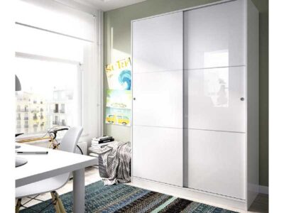Armario de 2 puertas correderas lisas en color blanco brillo. No llevan detalle de lineas plata en la puerta. Medidas: Alto 204cm, Ancho 120cm y Fondo 50cm. Este producto se entrega en kit. Dispone de manual de montaje incluido.