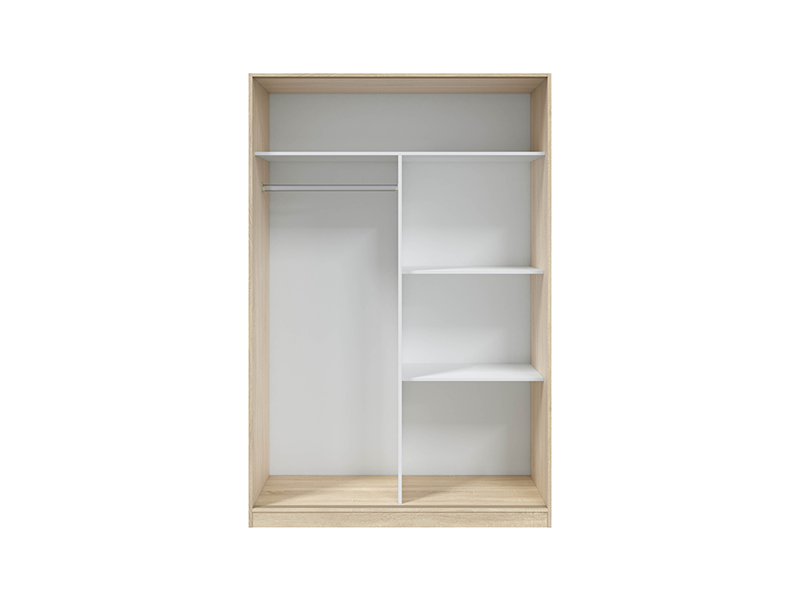 Medidas armario dos puertas: 120 cm (ancho) 200 cm (alto) x 50 cm (fondo).Acabado en melamina de calidad color Roble Canadian y Blanco Artik (Blanco Mate).El interior del armario incluye perchero y estante superior, además de tres estantes laterales.Armario adaptable a cualquier estilo de habitación o dormitorio. Tiradores en color blanco.