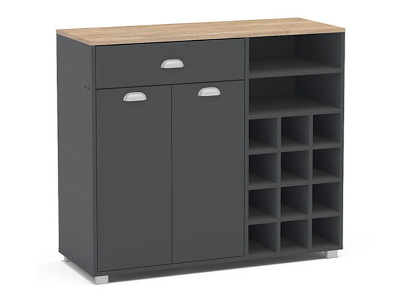 Mueble botellero con 1 cajón y 2 puertas. Tiene una balda interior dentro del armario interior.Acabado aglomerado melaminizado de 16mm. Color gris grafito con tapa roble aserrado. Tirador ABS pintado en gris plata.