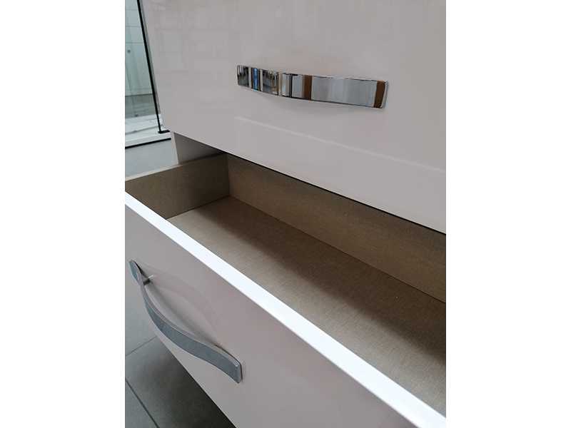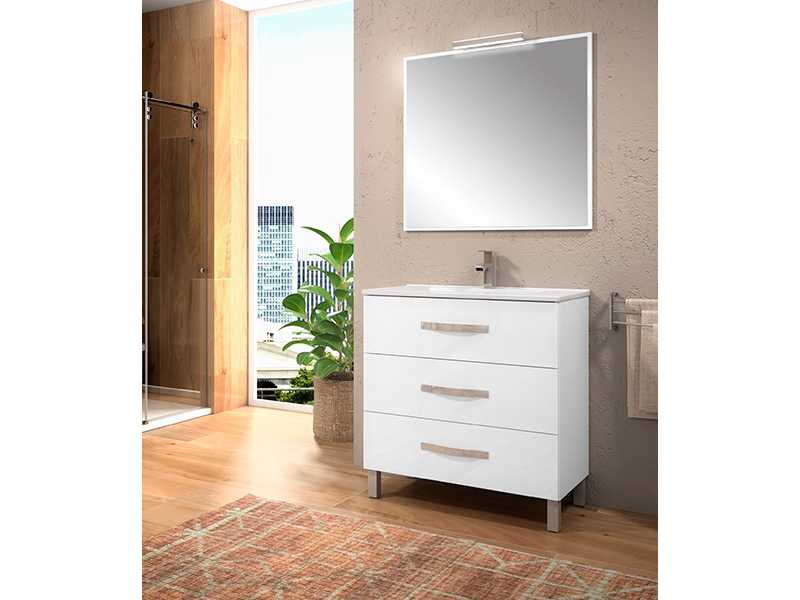 CARACTERÍSTICAS:Conjunto de baño formado por mueble de 3 cajones con patas, encimera y espejo. Luces LED incluídas. Fabricado en color blanco lacado y tiradores en metal cromado.MEDIDAS:Mueble:Ancho 81,5cm, Fondo 47cm y Alto 87,5cm.Espejo con trasera: 84x74cm.*Grifería y artículos de decoración NO INCLUÍDOS*