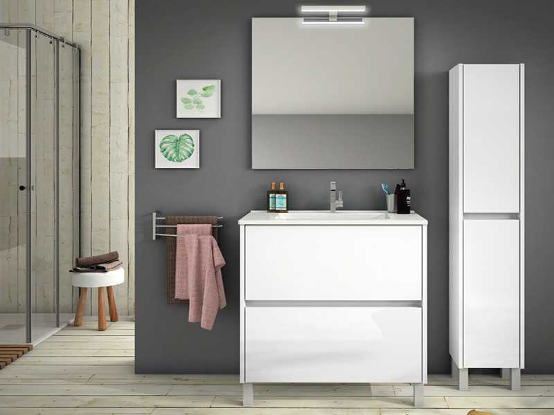 CARACTERÍSTICAS:Conjunto de baño formado por mueble de 2 cajones con patas, encimera, espejo y luces LED. Mueble de baño de 80 cm. en color blanco brillo. Patas metálicas en color gris. Apertura de los dos cajones desde la parte central del mueble.MEDIDAS:Mueble: Ancho 82cm, Fondo 47cm y Alto 87cm.Espejo: 80x60cm.*Grifería y artículos de decoración NO INCLUÍDOS*