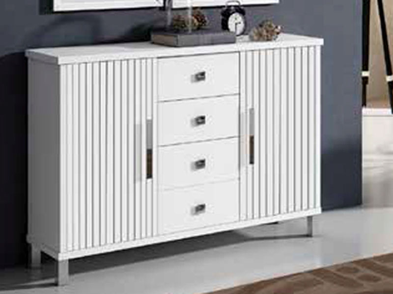 Recibidor color blanco con puerta rayada.2 puertas y 5 cajones.Medidas: Ancho 108 x Alto 98 x Fondo 28 cms.