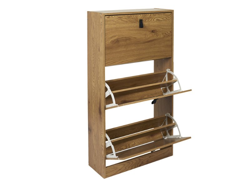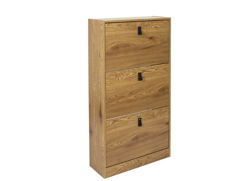 MUEBLE ZAPATERO 3 PUERTA ABBOTPerfecto para complementar los distintos mueblesde la serie Abbot.Con tres trampones abatibles y 2 estantes en cadauno de ellos.Medidas: 63 cm ancho x 24 cm fondo x 117 cm alto.