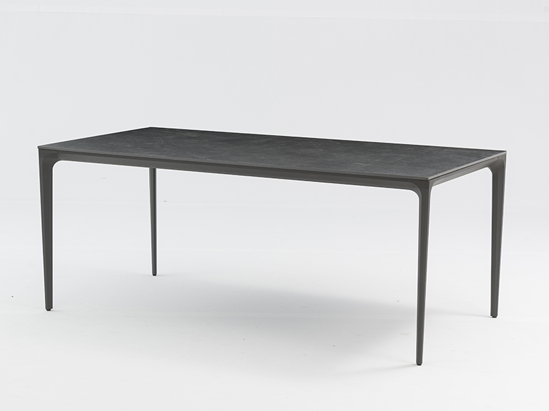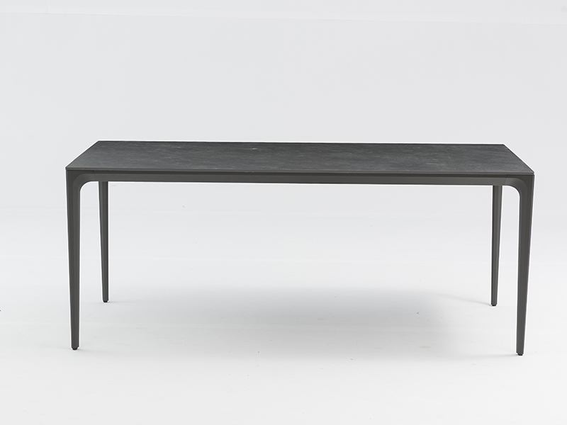 Mesa con tablero de piedra sintetizada y estructura en tubo de aluminio en acabado stone gris carbónMedidas: 135cm ancho x 80cm fondo x 74cm alto.