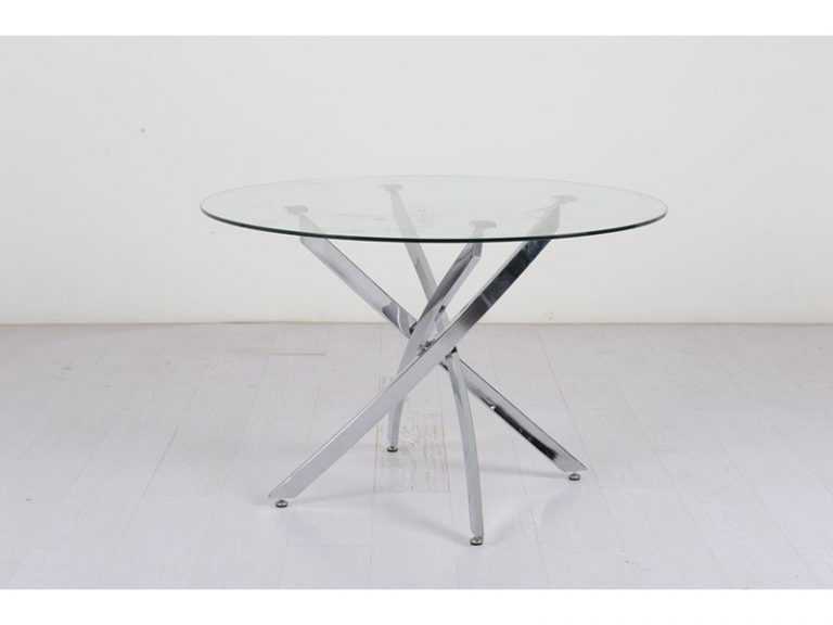 Mesa de comedor redonda con tapa de cristal de 8 mm de grosor y 114 cm de diámetro. Patas cromadasMedidas: 114 cm de diámetro x 74 cm alto