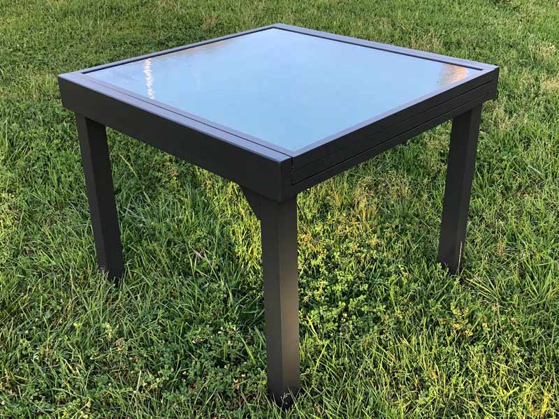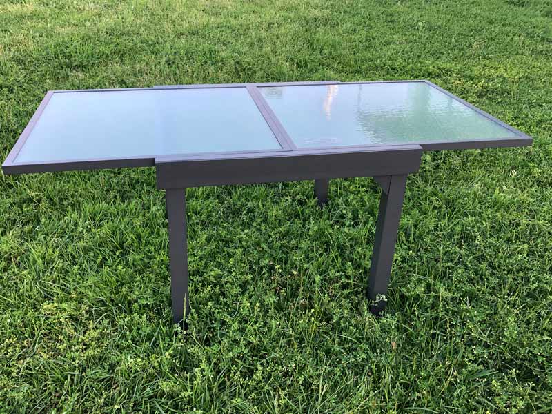 Mesa de aluminio color antracita con tapa de cristal claro. Mide 90 cm de fondo y 90 cm de ancho extensibles hasta 180 cmMedidas: 90 cm fondo x 90/180 cm ancho