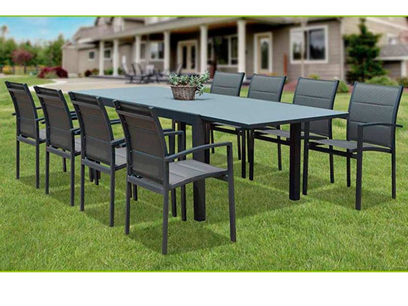 Mesa de aluminio color antracita con tapa de cristal negro. Mide 100 cm de fondo y 160 cm de fondo extensibles hasta 260 cm
