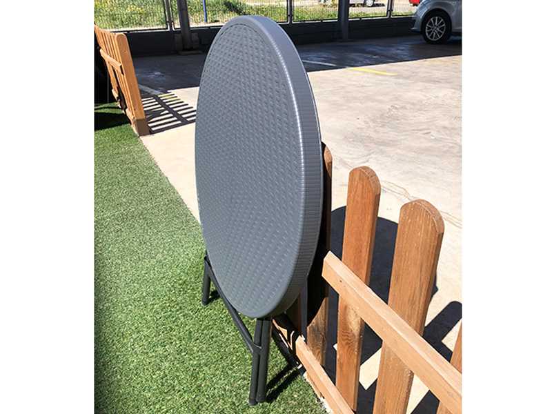 Mesa redonda plegable de 80 cm. de diámetro. Fabricada en polipropileno de color gris que simula un grabado y acero gris pintado, totalmente plegable y con un sistema de seguridad anticierre