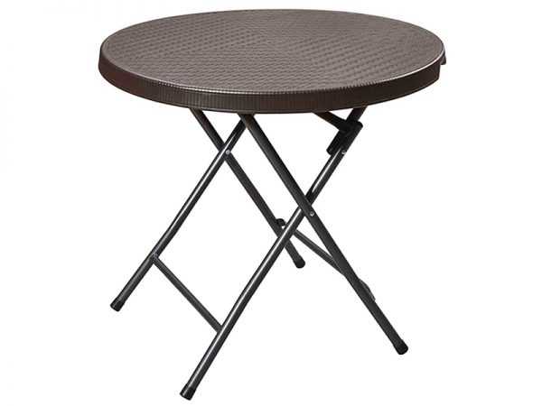 Mesa redonda plegable de 80 cm. de diámetro. Fabricada en polipropileno de color marrón y acero blanco pintado, totalmente plegable y con un sistema de seguridad anticierre.