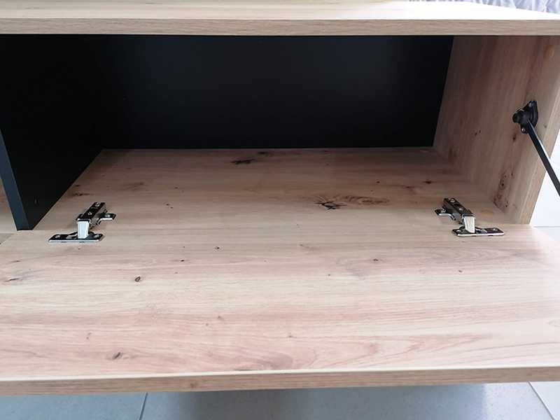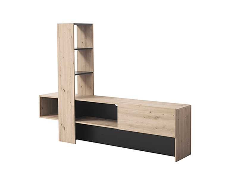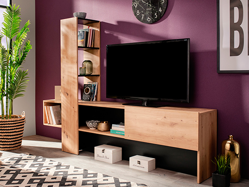 Mueble de TV con estante y puerta abatible en color roble. Estantes y trasera en color negro mate.Medidas: 185 cm x 36,5 cm x 138,5 cm.Ancho zona TV 128cm.