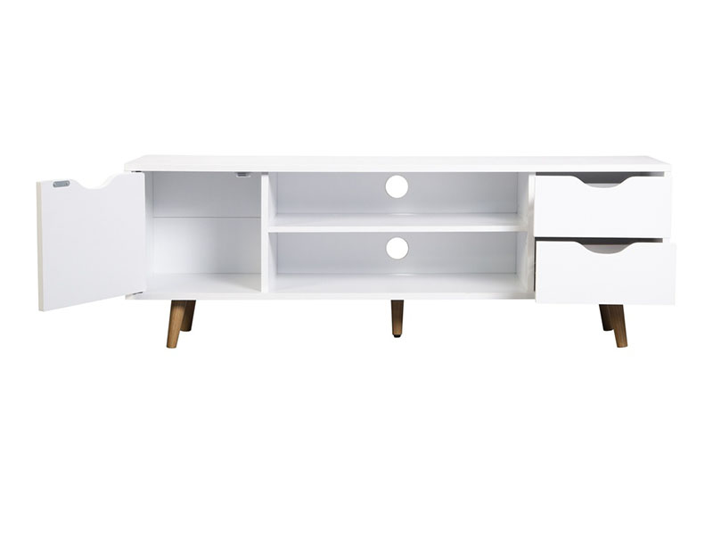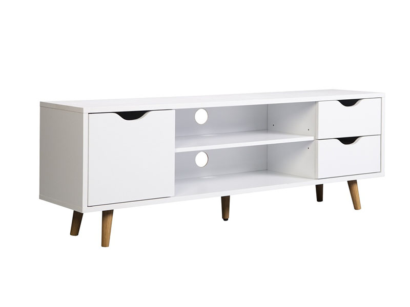 MESA TV FIANO BLANCA. Medidas del producto (Ancho x Profundo x Alto): 1200x280x41mm, 17,5KGS.Materiales: Aglomerado lacado. Tiradores y patas en Madera de pino lacado medidas