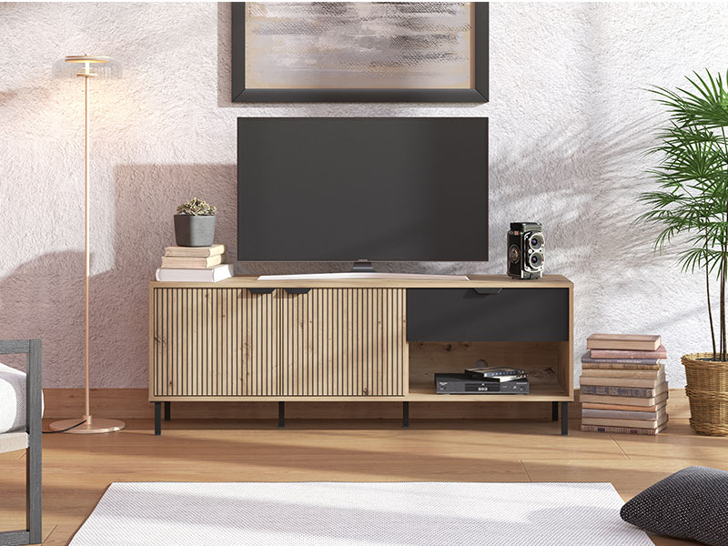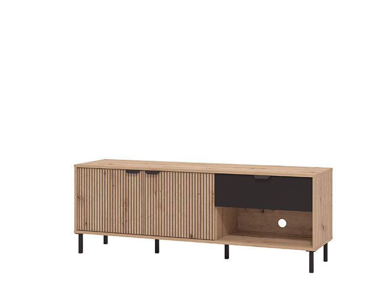 El mueble para TV MAYENNE TV 150 3K1F2V es un accesorio funcional para decorar el salón. La combinación de decoración artesanal en roble, roble artesanal con rayas que destaca en los frentes, así como lámina negra mate, hace de este sistema de elementos un sello de estilo que los interiores modernos necesitan. Los llamativos decorados en contraste contribuyen a acentuar la línea de diseño sencilla, que se expresa además con las patas altas. Dos segmentos cerrados, un cajón y un estante abierto contribuyen eficazmente a la organización funcional del salón. Forma parte del sistema de elementos del mismo nombre para organizar el ambiente del salón, que representa una solución atractiva para todos los amantes del diseño interior moderno.Medidas:150,5 cm ancho x 40 cm fondo x 54,5 cm alto
