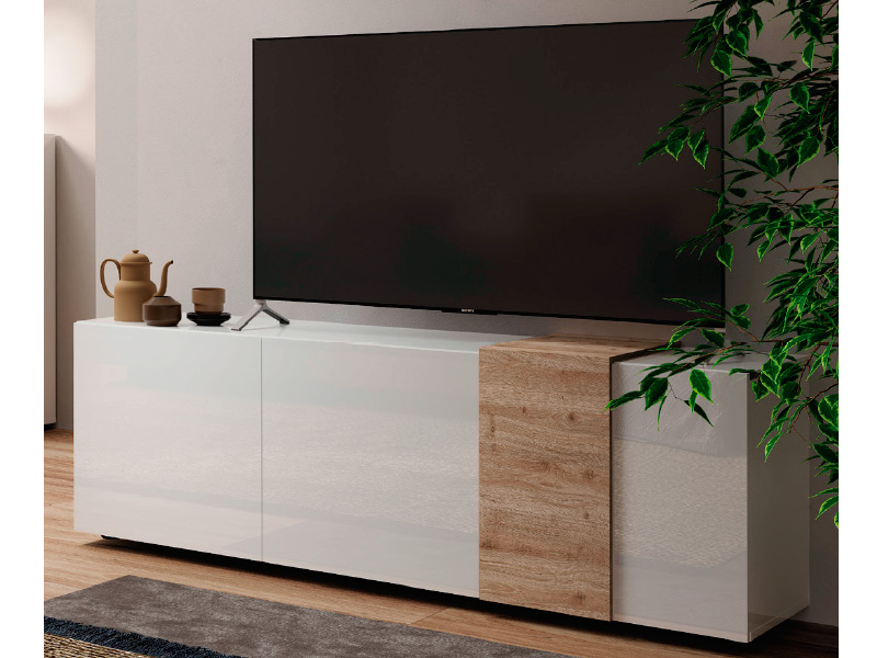 Mueble de TV de 3 puertas en acabado blanco brillo/roble.Medidas: 181cm ancho x 57cm alto x 44 cm fondo