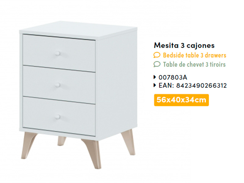 Mesita de 3 cajones color blanco.Melamina alta resistencia.Fácil montaje y limpieza.Guías metálicas.