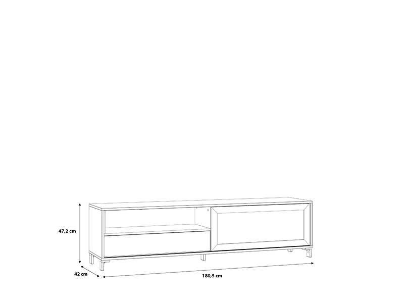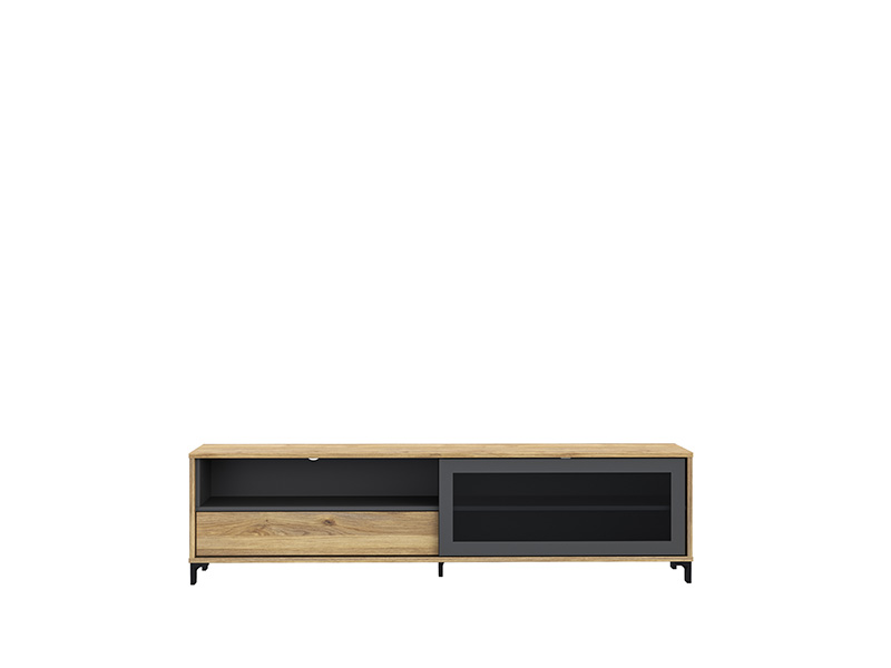 Módulo tv acabado en color roble y gris, de madera mezclado con grafito, su única puerta es de cristal, lo que te permite ver el interior, cajón y hueco.Dimensiones: 180,5 (ancho) x 39,7 (fondo) x 47,2 cm (alto).