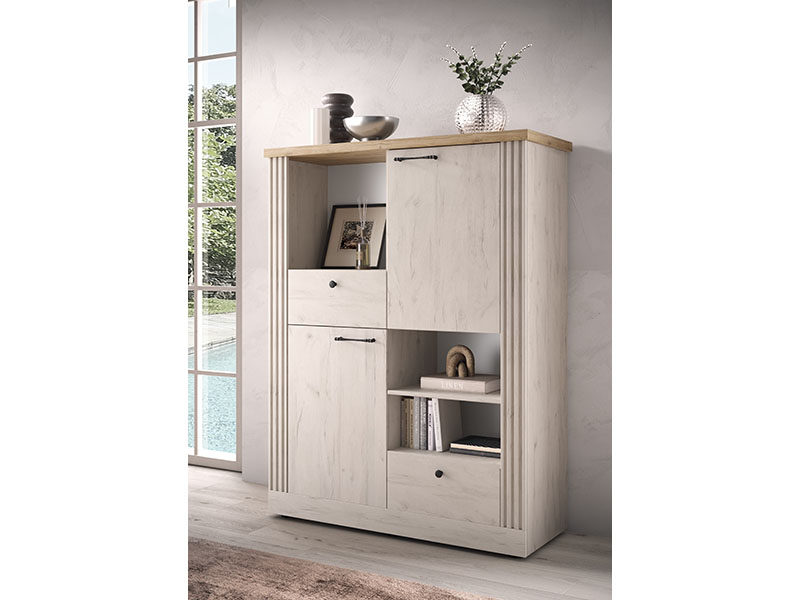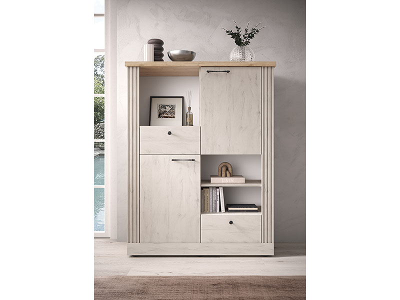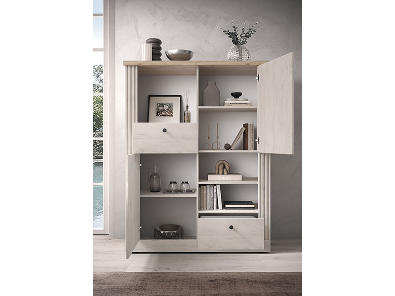 Vitrina de 2 puertas y 2 cajones en color roble meringa combinado con roble Cádiz.Medidas: 118x160x44cm