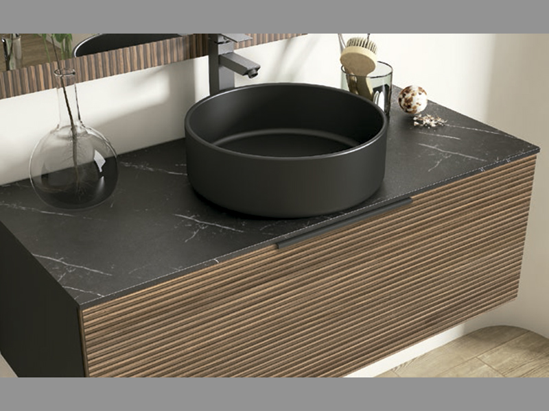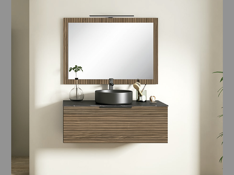 Mueble de baño suspendido de 1 cajón. Tirador en color negro. Armazón en color negro mate y frente del cajón en color Bastilla. Tapa encimera de DM hidrófugo en color negro marquina. Resistente a impactos, rayados, agua y antibacteriano. Espejo con marco y aplique LED. Interior cajón tela textil beige. Bisagras 35mm. Cierre amortiguado.