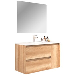 Mueble de baño suspendido de 1 cajón en color cemento. Con tirador en color negro, aluminio o blanco. Lavabo encimera en color blanco. Con espejo básico. Interior cajón tela textil beige. Bisagras 35mm. Cierre amortiguado.
