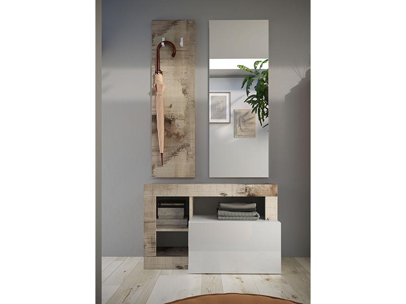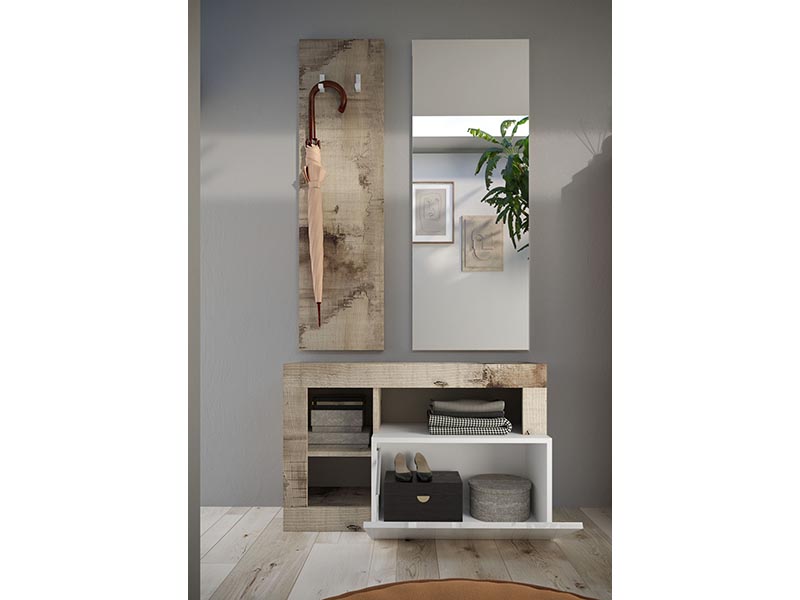 Recibidor formado por 3 piezas:Panel porta abrigos , espejo y base.Acabado en blanco brillo y pero.