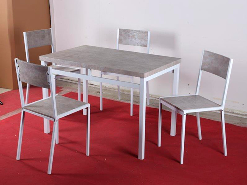 Conjunto de mesa y 4 sillas.Tablero con DM y PVC gris cemento.Paras de acero pintado en blancoTablero melamínico aligerado de 40mmMedidas mesa: Ancho 110cm y Fondo 70cm.Medidas silla: Ancho 40cm y Fondo 48cm.