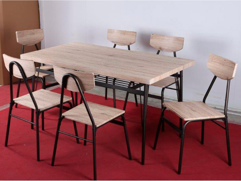 Patas de acero pintado en marrón oscuro.Tablero melamínico aligerado de 40mm y PVC marrón.Medidas mesa: Ancho 140cm y Fondo 80cm.Medidas silla: Ancho 49cm y Fondo 53cm.