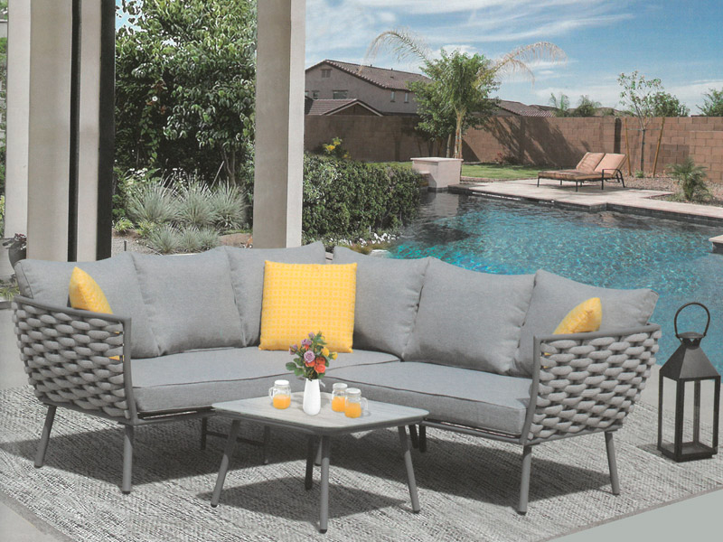 SET RINCONERA ALUM./CUERDA GRIS. Cristal de 5 mm, con cojines de 200 gr, en poliéster waterproof. 1 sofá de 2 plazas W115xD79xH67 cm, + 1 sofá 3 plazas, L174xP82xH67 cm, + 1mesa centro 60x60x40 cm.