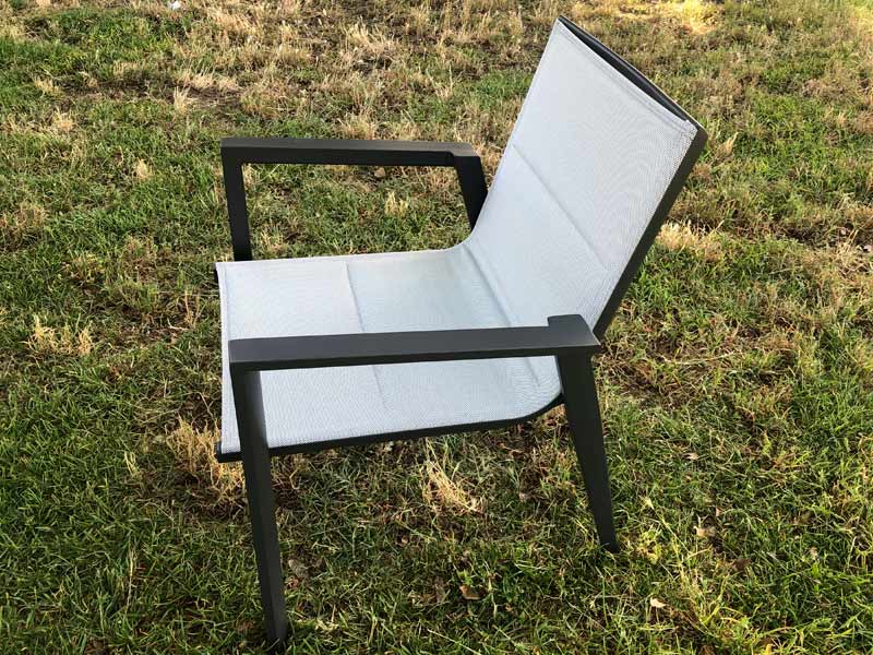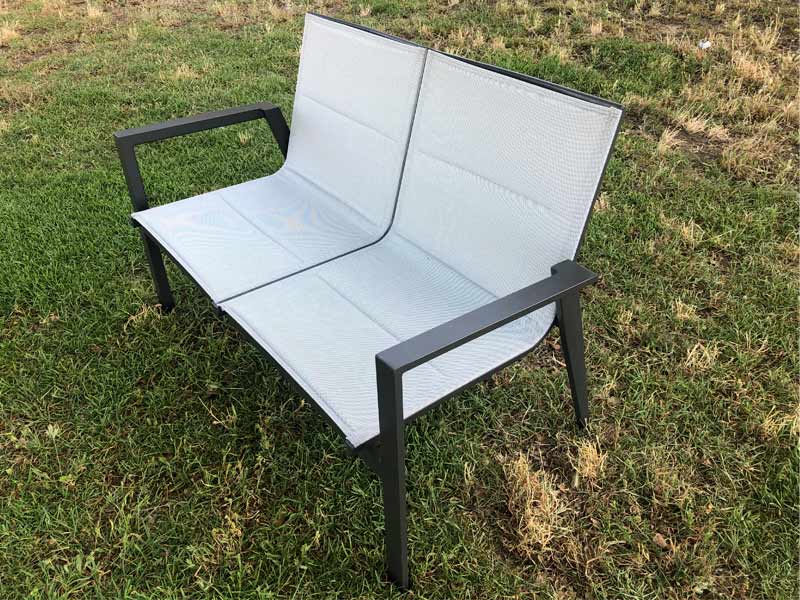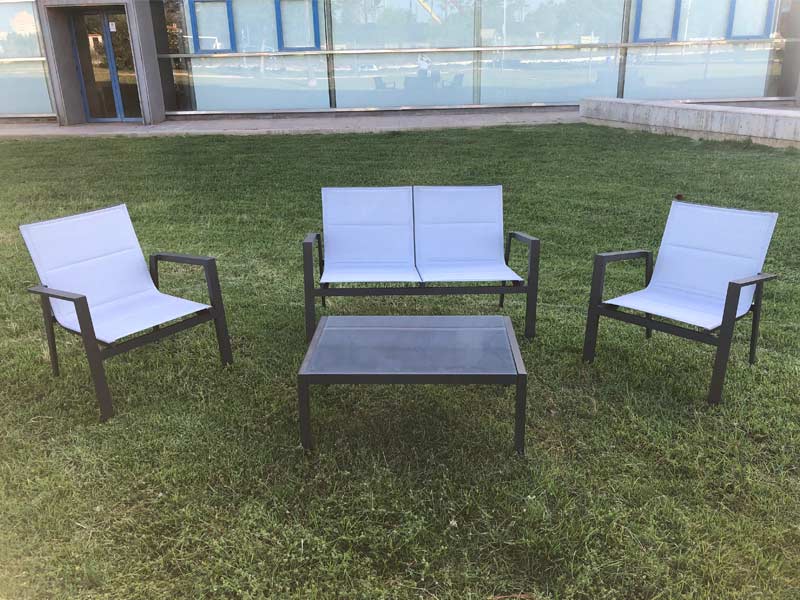 Tresillo de aluminio antracita mate con mesa de centro. Formado por 1 mesa de centro , 1 sofa y 2 sillones. El sofa y los sillones cuentan con textilene acolchado doble de color gris.Medidas mesa centro: 110 cm ancho x 70 cm fondo x 40,5 cm altoMedidas sofa: 120,5 cm ancho x 71 cm fondo x 83 cm altoMedidas sillones: 69,5 cm ancho x 71 cm fondo x 83 cm alto