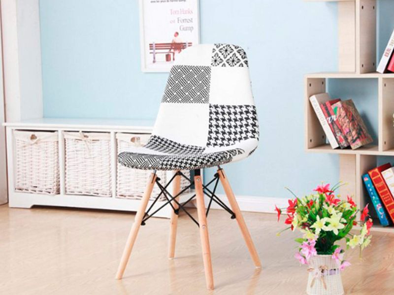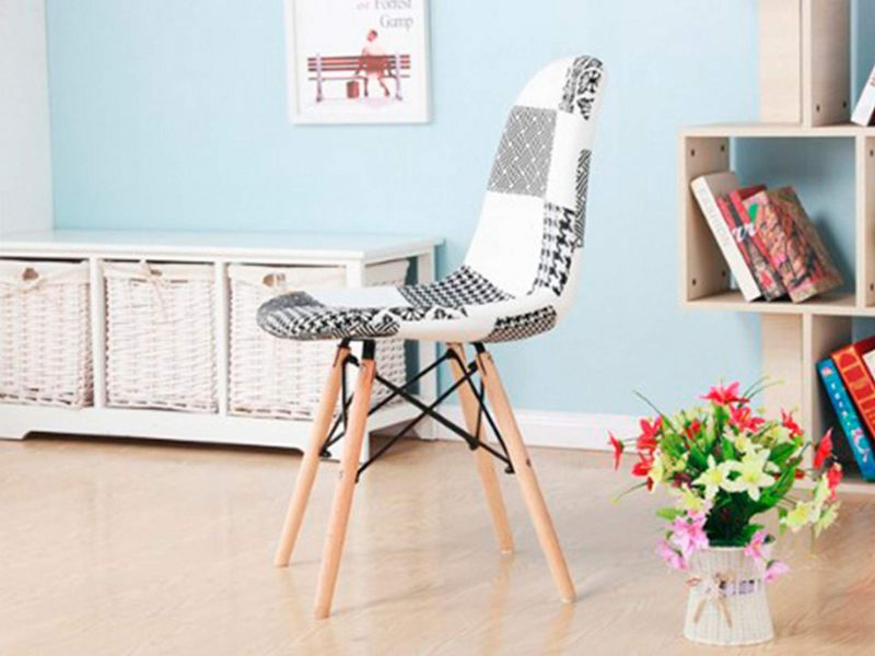 Silla tapizada en tela patchwork blanco y negro. Estructura con patas redondeadas en madera haya (tornillos visibles) y barras metálicas en negro en la parte inferior del asiento.Medidas: Ancho 56cm, Fondo 50cm y Alto 83cm.