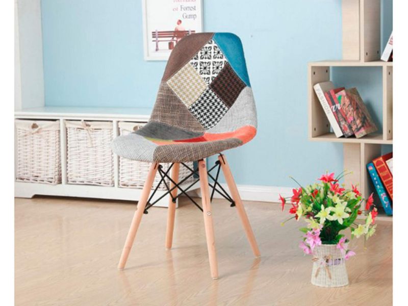 Silla tapizada en tela patchwork multicolor. Estructura con patas redondeadas en madera haya (tornillos visibles) y barras metálicas en negro en la parte inferior del asiento.Medidas: Ancho 56cm, Fondo 50cm y Alto 83cm.