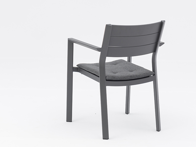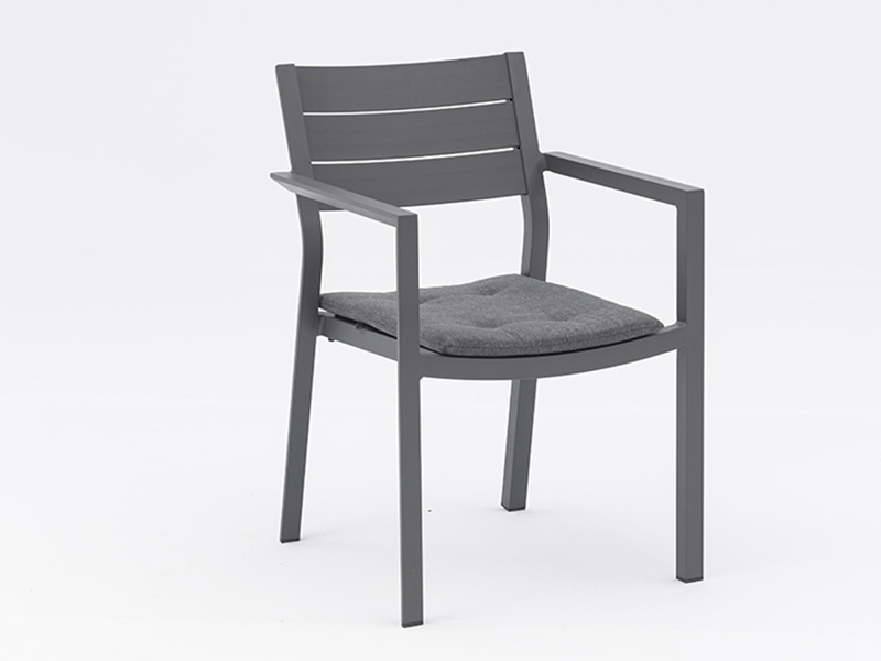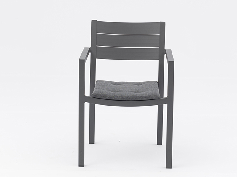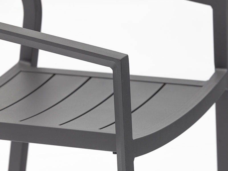 Silla Estructura de aluminio tubo de 35x30xT1.8 mm, acabado en pintura gris carbón. Asiento y respaldo de lamas de aluminio del mismo color. Cojín no incluido.Medidas: 56cm ancho x 58cm fondo x79cm alto.