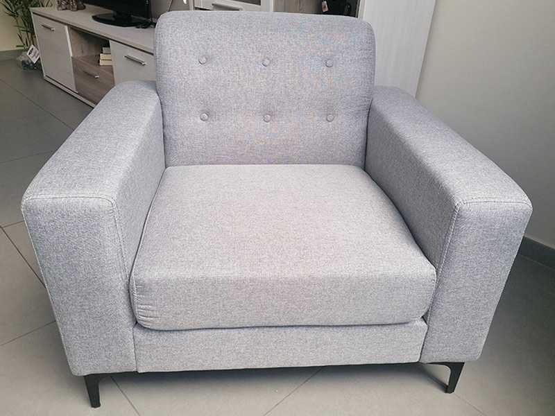 Sillón de 1 plaza tapizado en tela color gris claro. Diseño del respaldo con botones. Patas metálicas en color negro.Medidas: Ancho 92cm, Fondo 79cm y Alto 80cm.