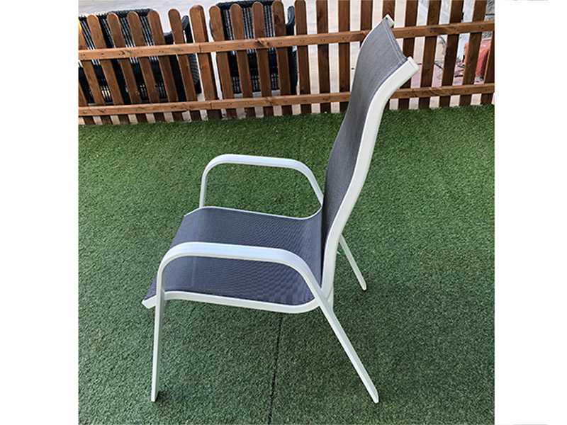 Sillón de aluminio blanco con textilene de color antracita. Las sillas son apilables.Medidas: Ancho 74cm, Fondo 56,5cm y Alto 103cm.