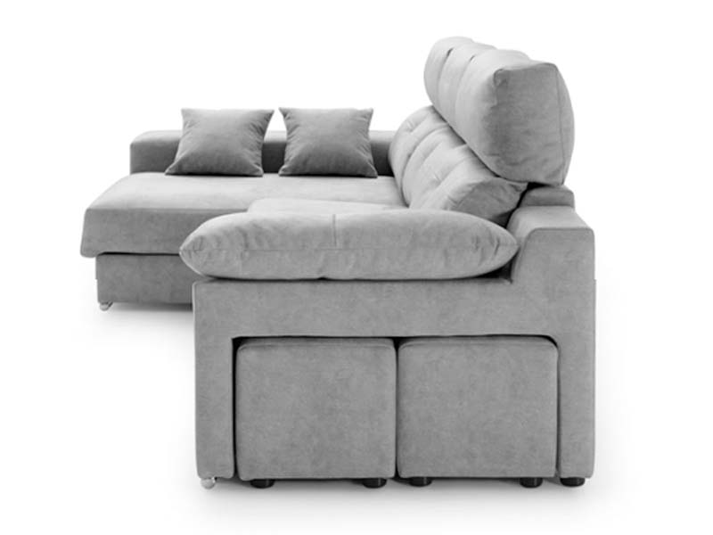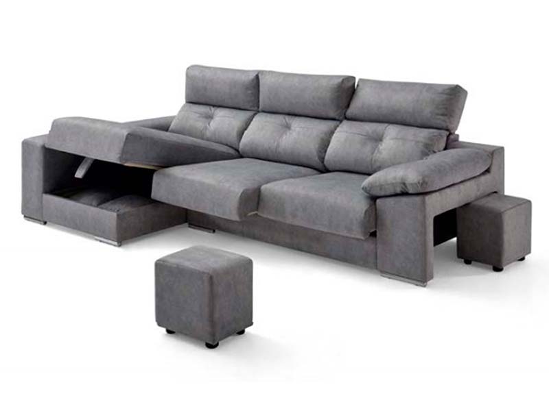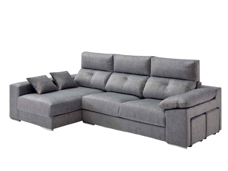 Sofá reclinable varios colores 280cm. Tapicería : A elegir. Desenfundable: Sí Armazón: Madera de pino con costado DM y aglomerado de 1ª calidad, reforzado con escuadras. Las estructuras y los brazos van revestidos con espuma de poliuretano. Mecanismos: Deslizante punto a punto. Respaldo reclinable 10 posiciones. Patas: Cromadas. Base Respaldo: Relleno de 50% de fibra hueca siliconada y 50% goma picada 1ª calidad, desenfundable individualmente, cabezal reclinable. Almohadas de asiento: Núcleo de poliuretano 33kg + capa superior de 35 SS + Fibra hueca siliconada Medidas del sofá por plazas : 3 plazas + chaiselongue + puffs 280cm