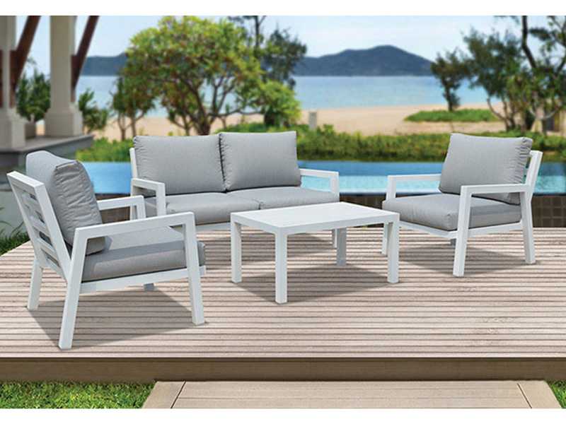 Tresillo de aluminio blanco compuesto por 1 sofa de 2 plazas, 2 sillones y 1 mesa de centro de 90×60 cm. Cojines de color gris incluidos.
