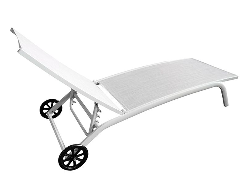 Tumbona con ruedas fabricada en aluminio color blanco. Combinada con textil color gris mixto.Medidas: 193cm x 61cm x 92,50/30cm.