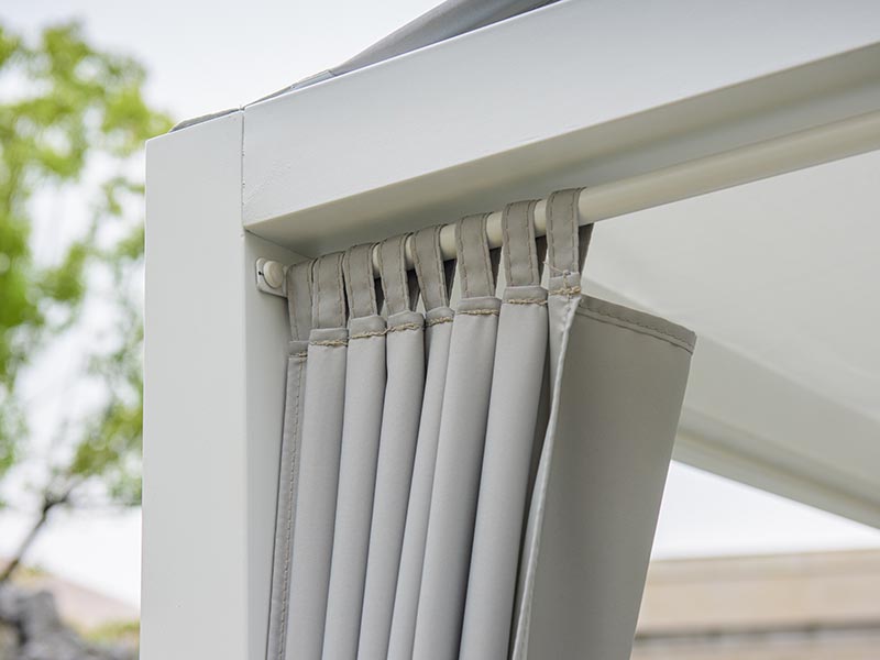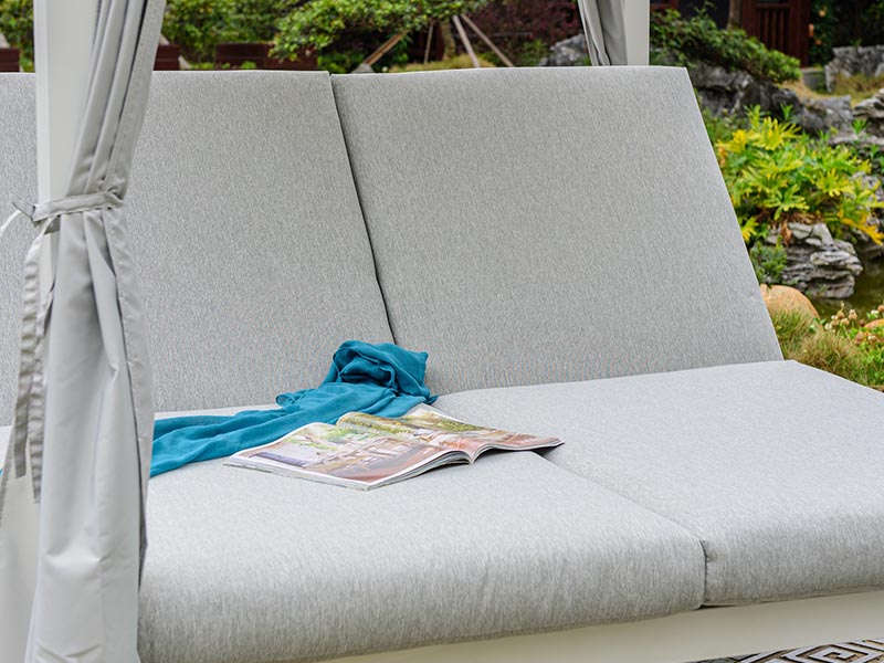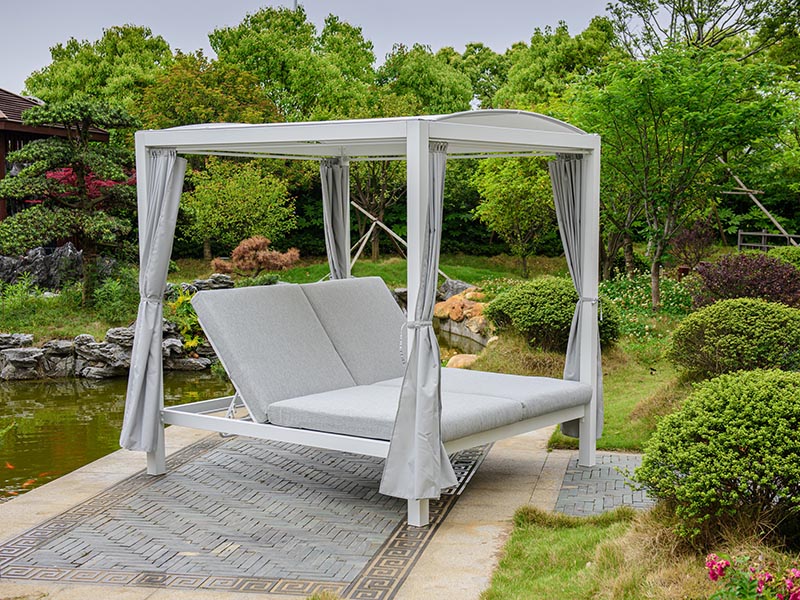 Estructura en aluminio.En su parte superior recubierta por un toldo.Dispone de 4 cortinas independientes.Los cabezales de las tumbonas son regulables a diferentes posiciones e independientes.Cojines muy confortables con tela tratada para repeler los líquidos.Instalación no incluida en el precio.