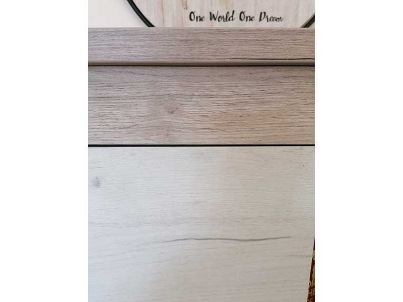 Vitrina de 2 puertas fabricada en melamina en color blanco roble y gris roble. Una de las puertas con cristal. Tiradores metálicos en color gris ceniza.Medidas: Ancho 99,50cm, Fondo 36,50cm y Alto 195cm.