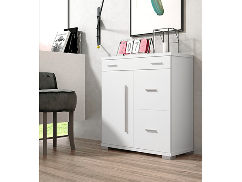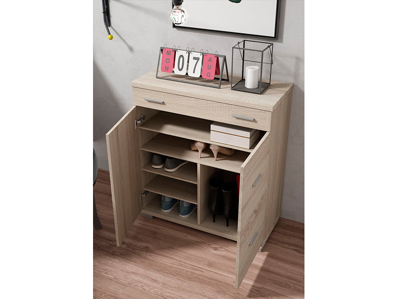 Zapatero de 2 puertas y 1 cajón. Detalle linea negra en la puerta derecha. Medidas: Ancho 74,5cm, Fondo 35cm y Alto 97cm.